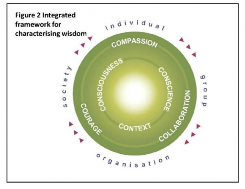 And the model is saying wisdom means having the characteristics in balance. Collaboration sounds like a good thing, but it's not a good thing, per se, if you're collaborating around something that's not for the greater good, which is where conscience comes into play.